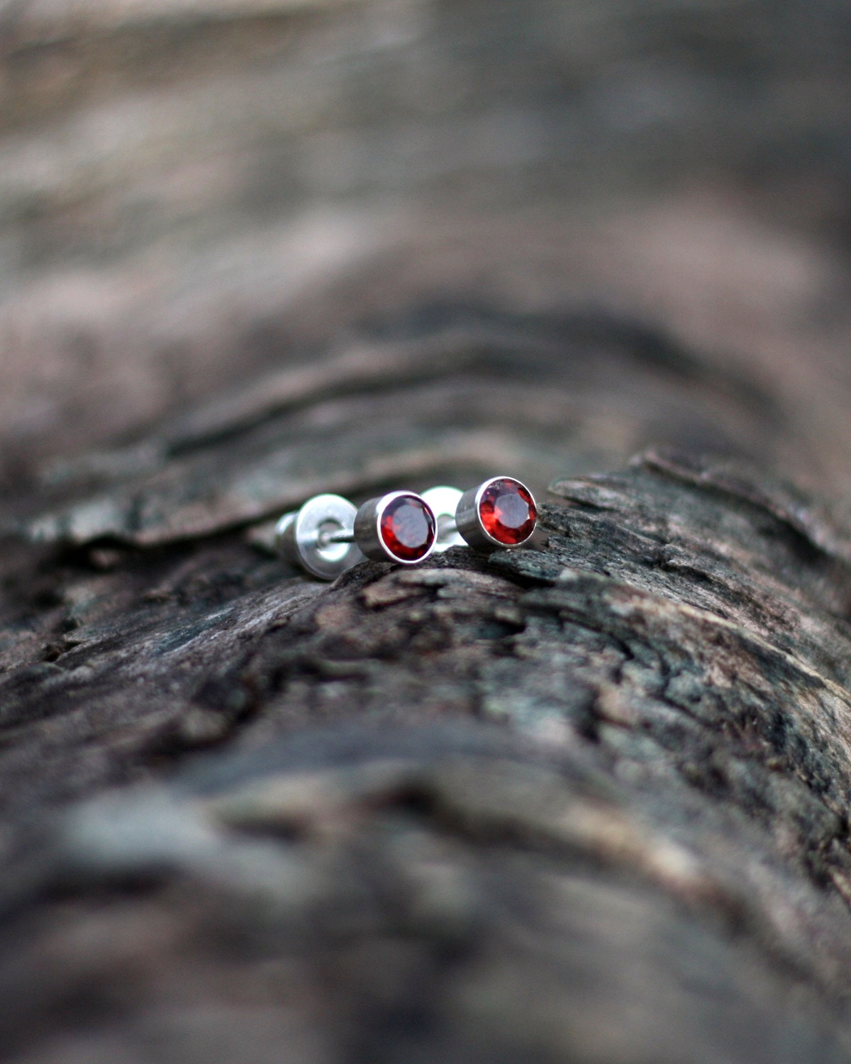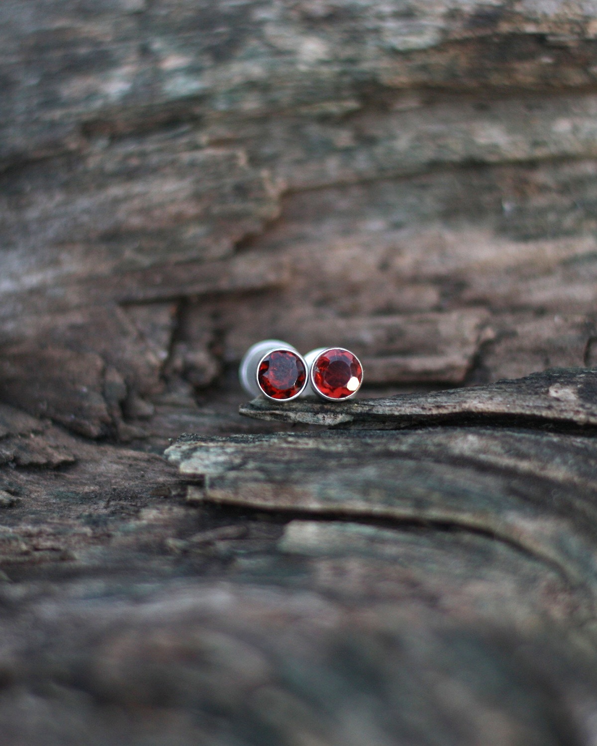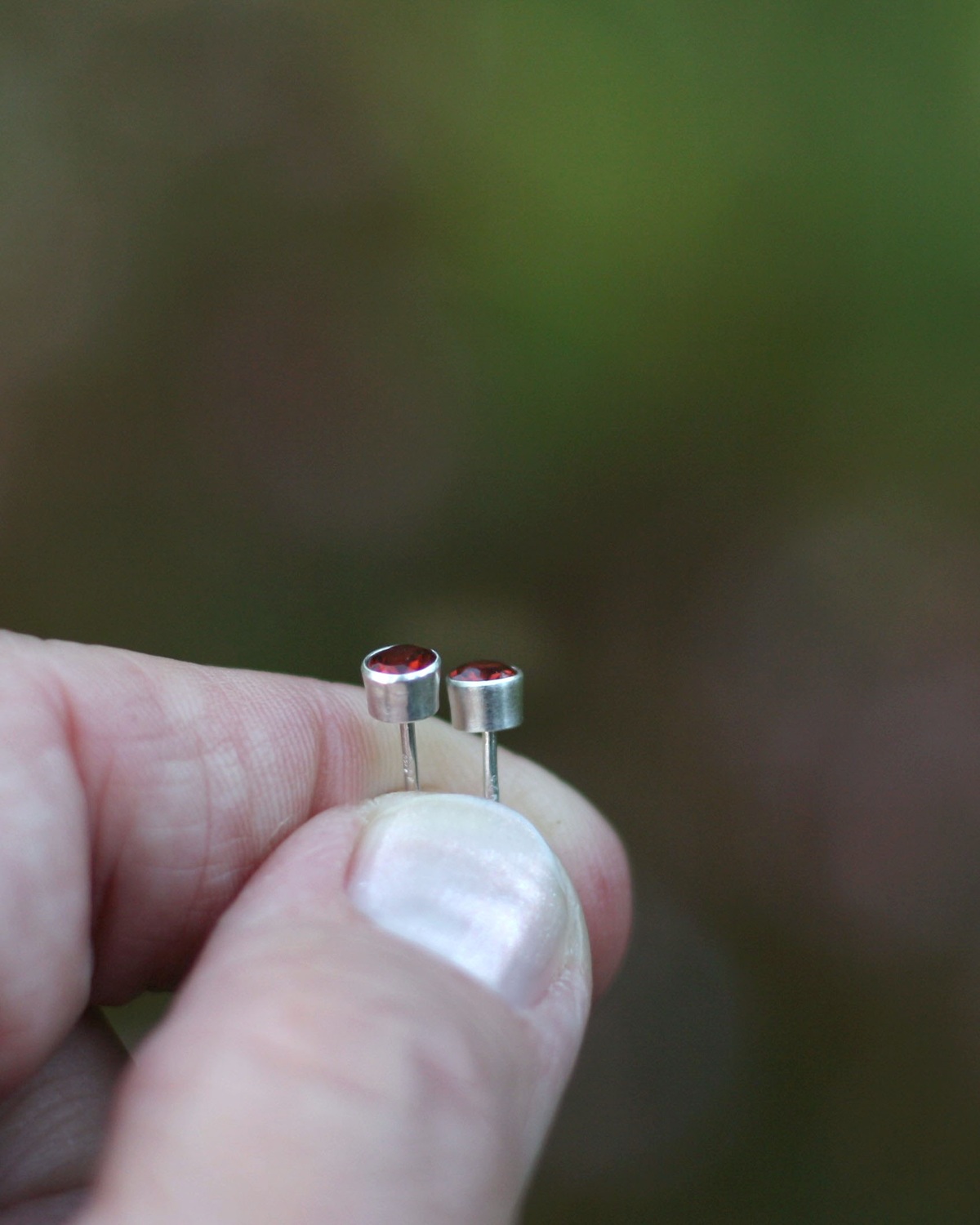 Handmade small silver Ag 925/1000 stud earrings with cut red garnet, origin Africa.