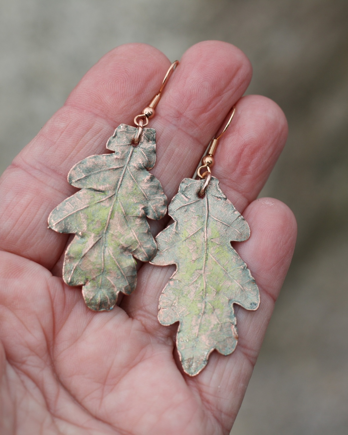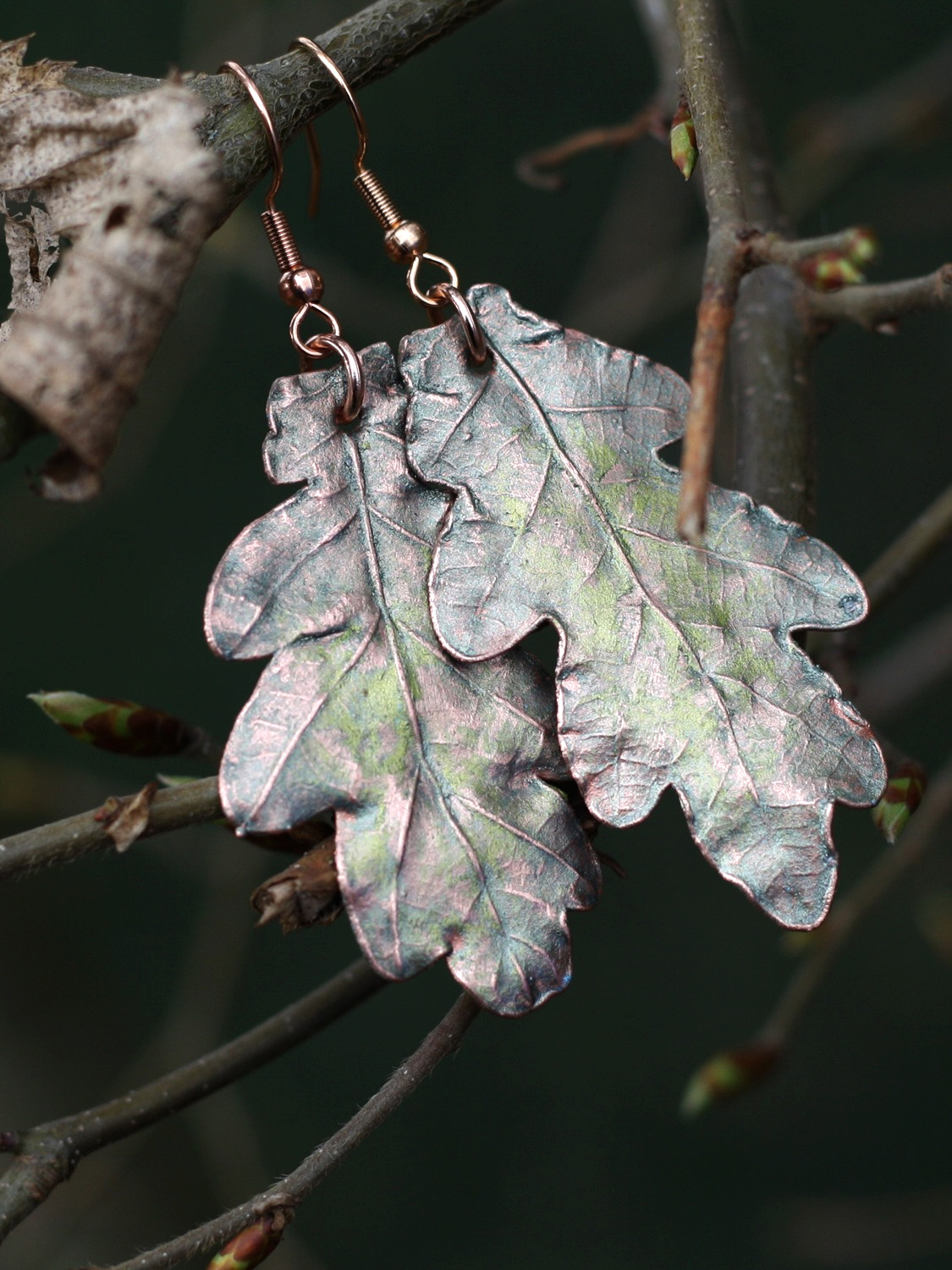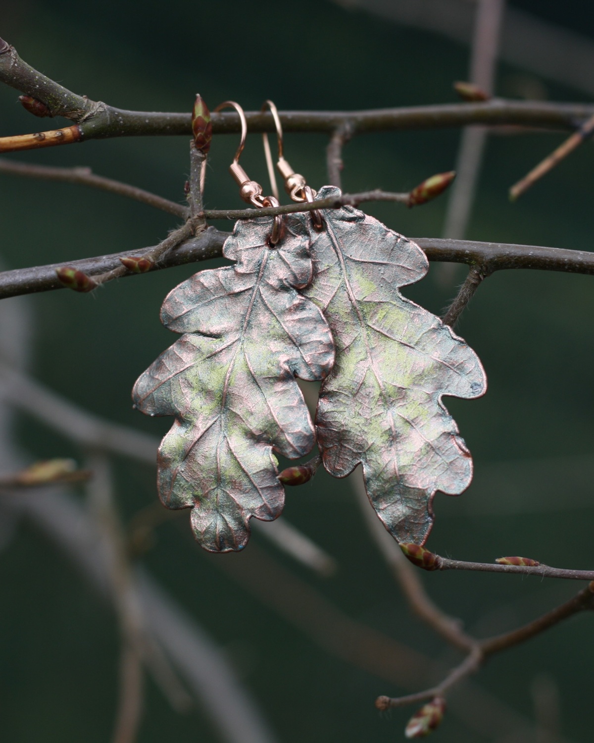 Lehoučké náušnice – mědí pokovené opravdové listy dubu.