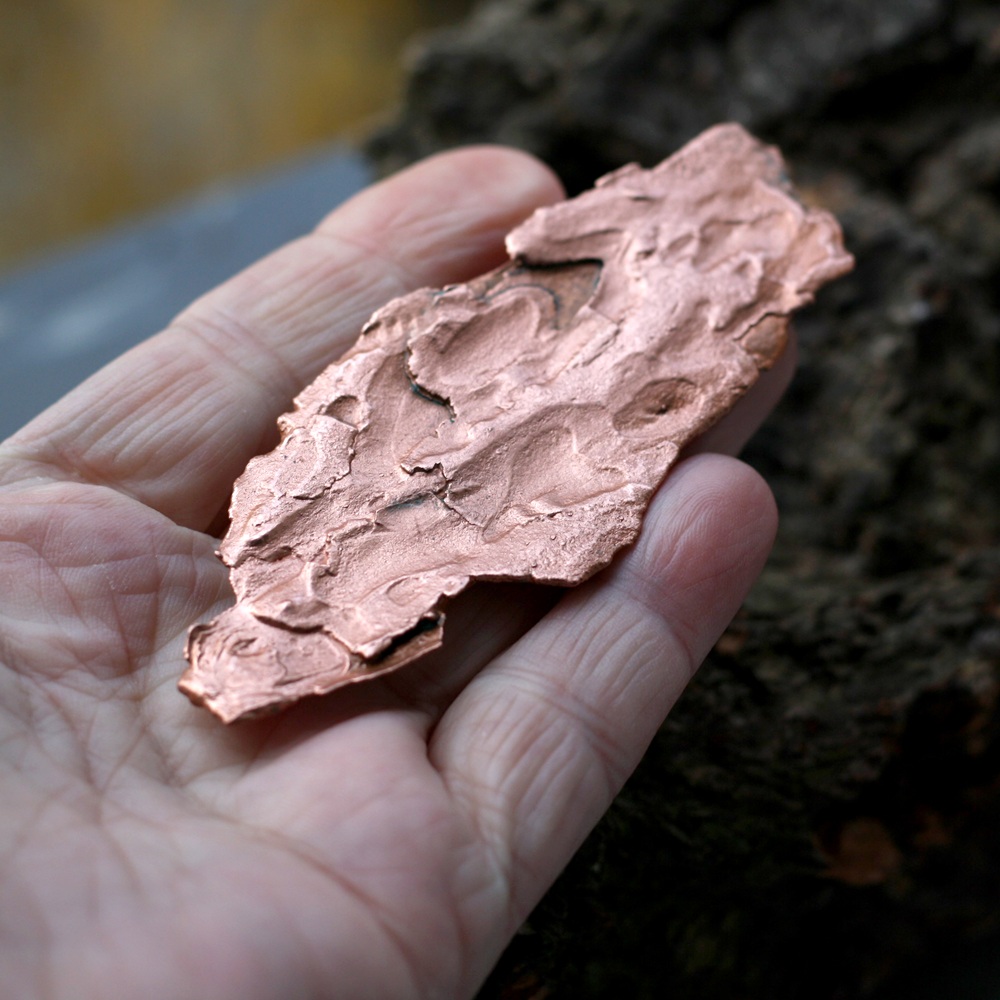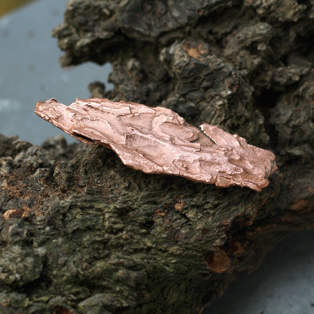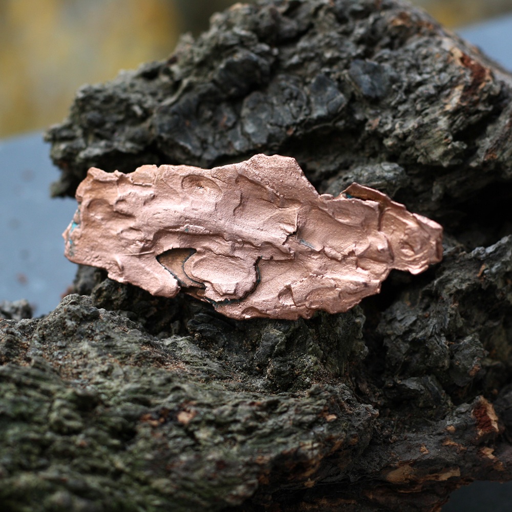 Šperk vznikl v mé dílně složitým a časově náročným procesem galvanickým pokovením ryzí mědí. Měď je pevná, přesně kopíruje povrch přírodniny, včetně prasklinek a různých nerovností.
