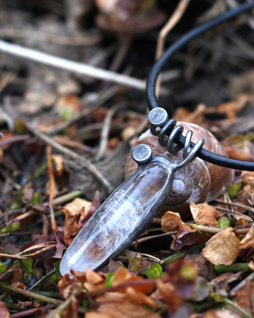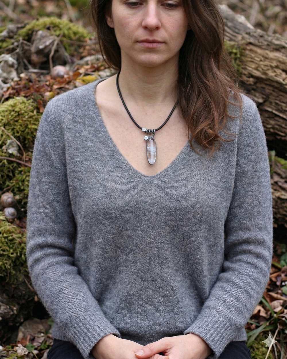 Tento náhrdelník není jen ozdobou, je to zastavený čas. Ručně pájený cín objímá ohlazený křišťál, který ve svém srdci nese drobné inkluze – tichá svědectví věků. Stačí, aby se do kamene opřelo slunce, a rozehraje se podívaná plná harmonie a skrytých příběhů, které znáte jen vy. Je to jediný kus na světě.