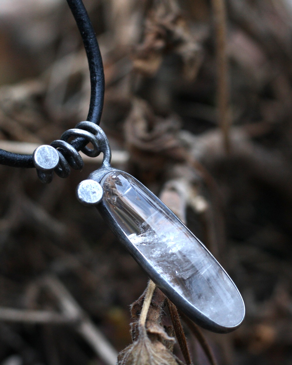 Ručně pájený cín objímá ohlazený křišťál, který ve svém srdci nese drobné inkluze