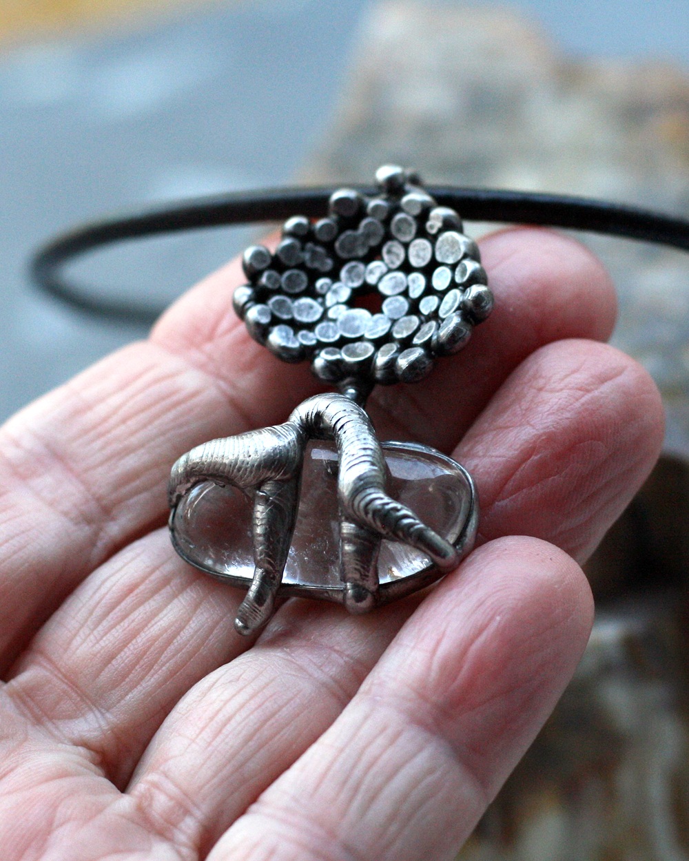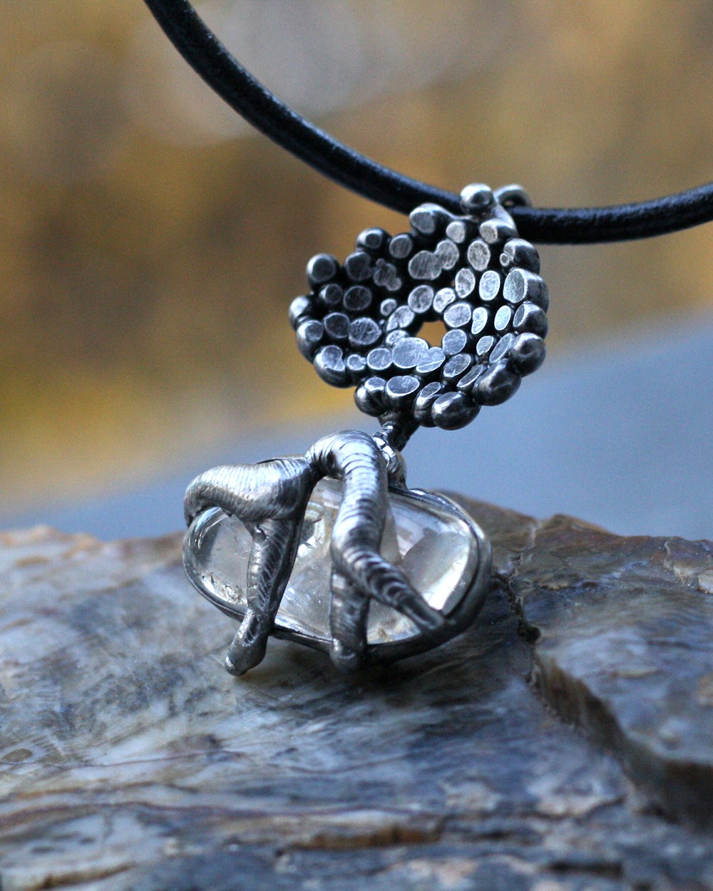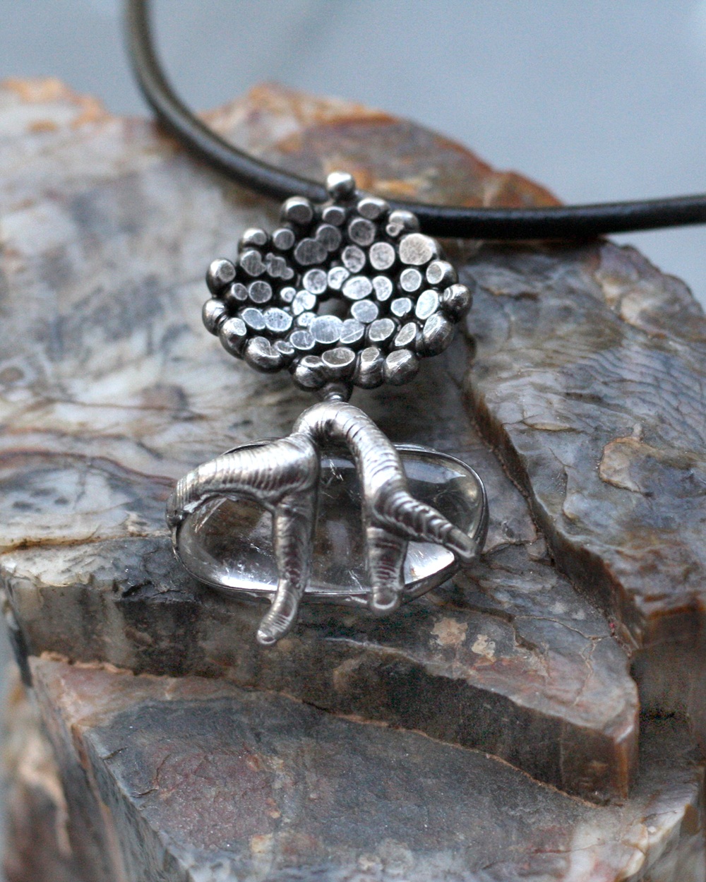 Zavěšeno na černé kůži, délka 50 cm nebo dle přání zákazníka, zapínání na karabinu z chirurgické oceli.