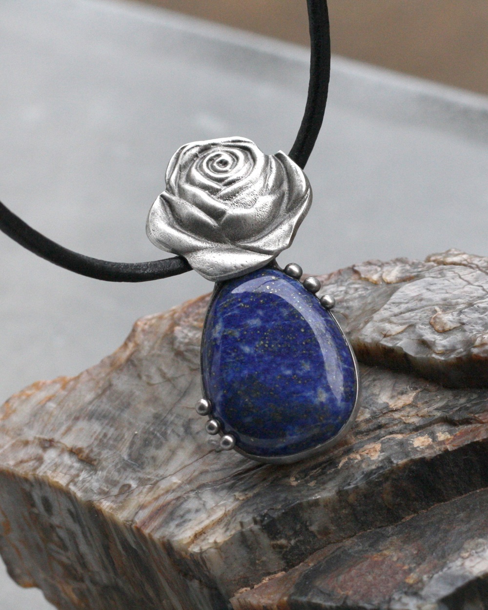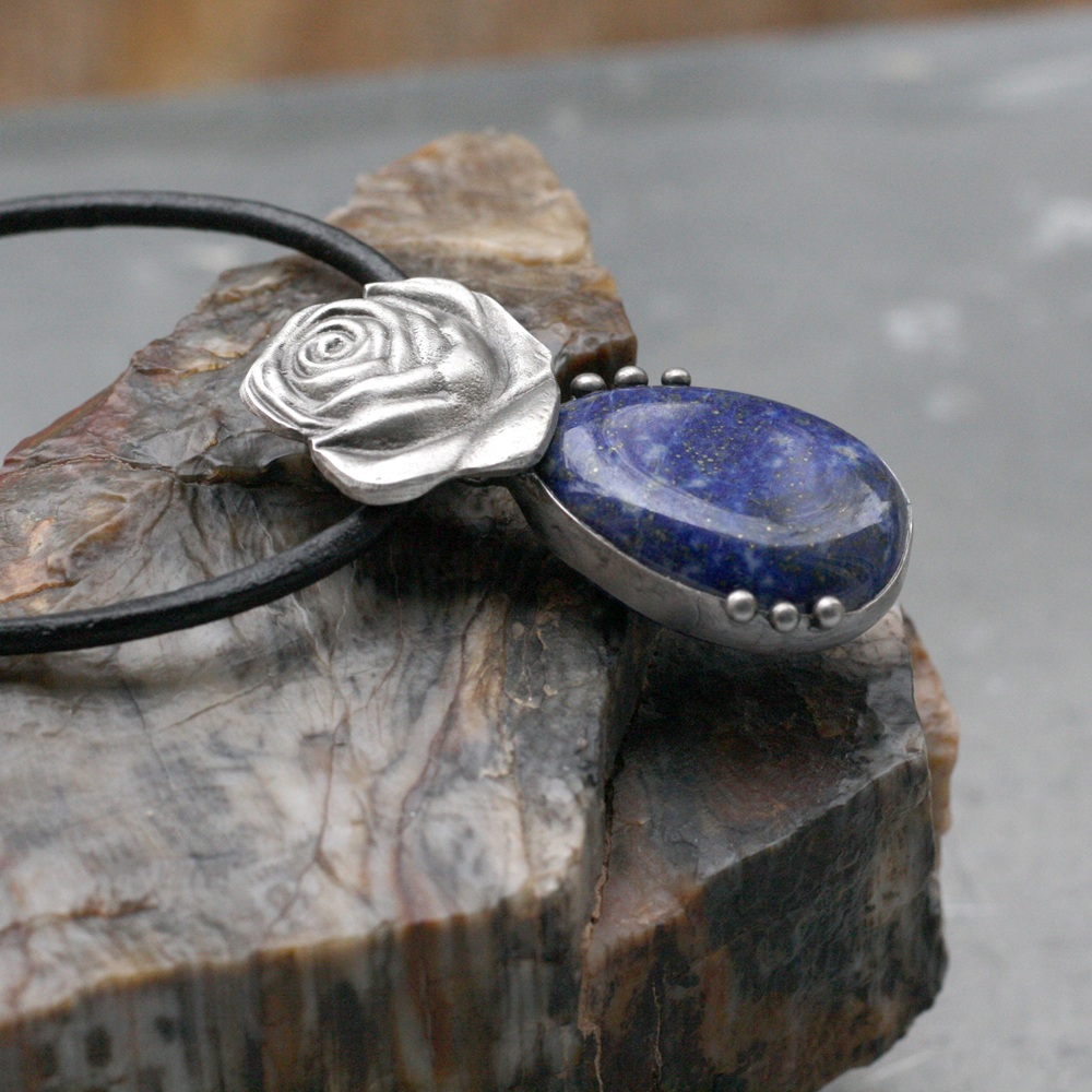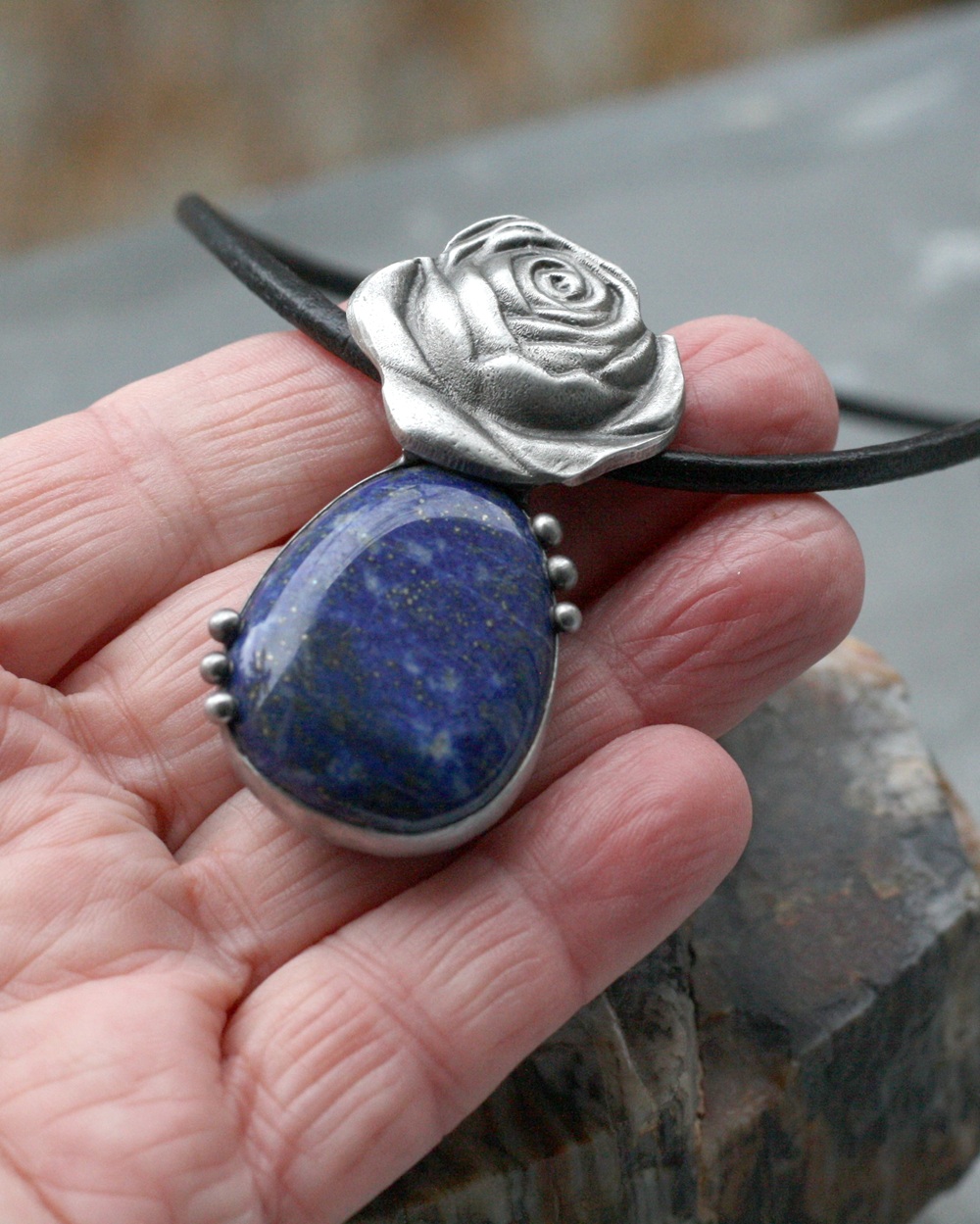 Ručně vyrobený cínovaný náhrdelník s velkým leštěným lápisem lazuli. Hodí se jako dárek k cínové svatbě – výročí 10 let.