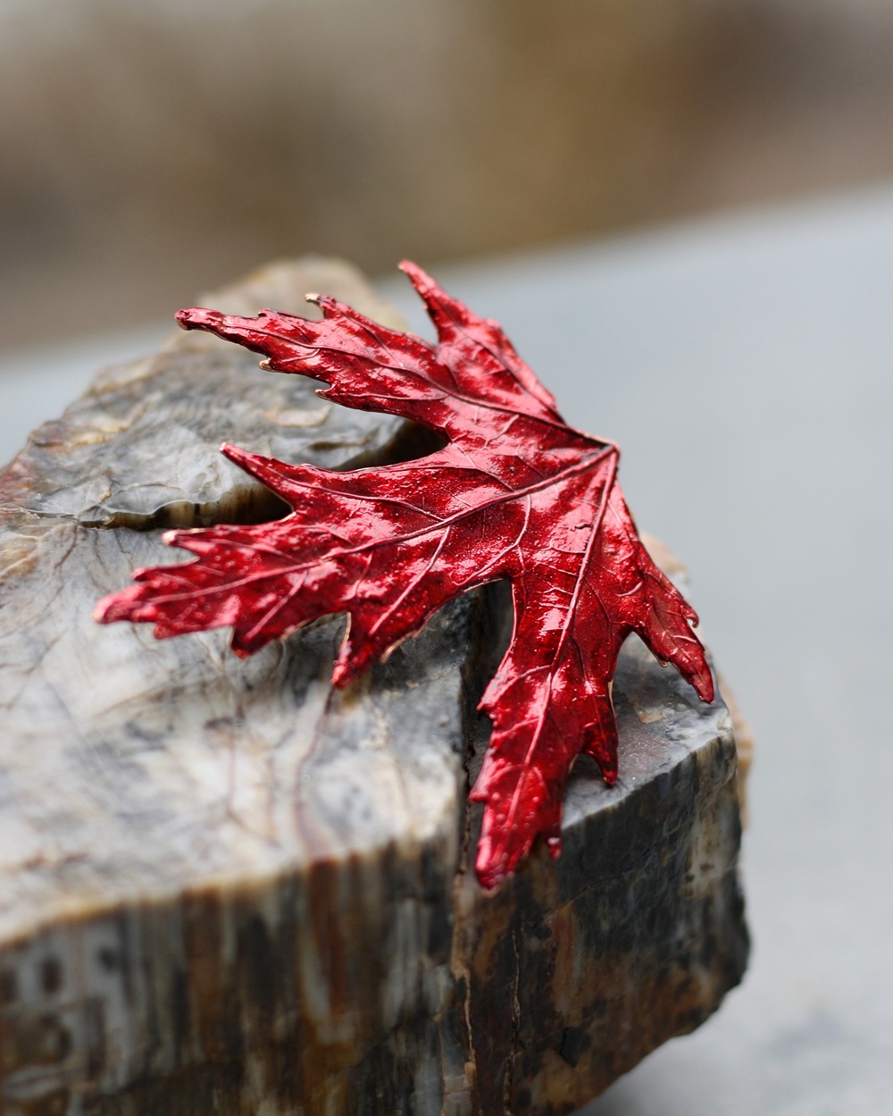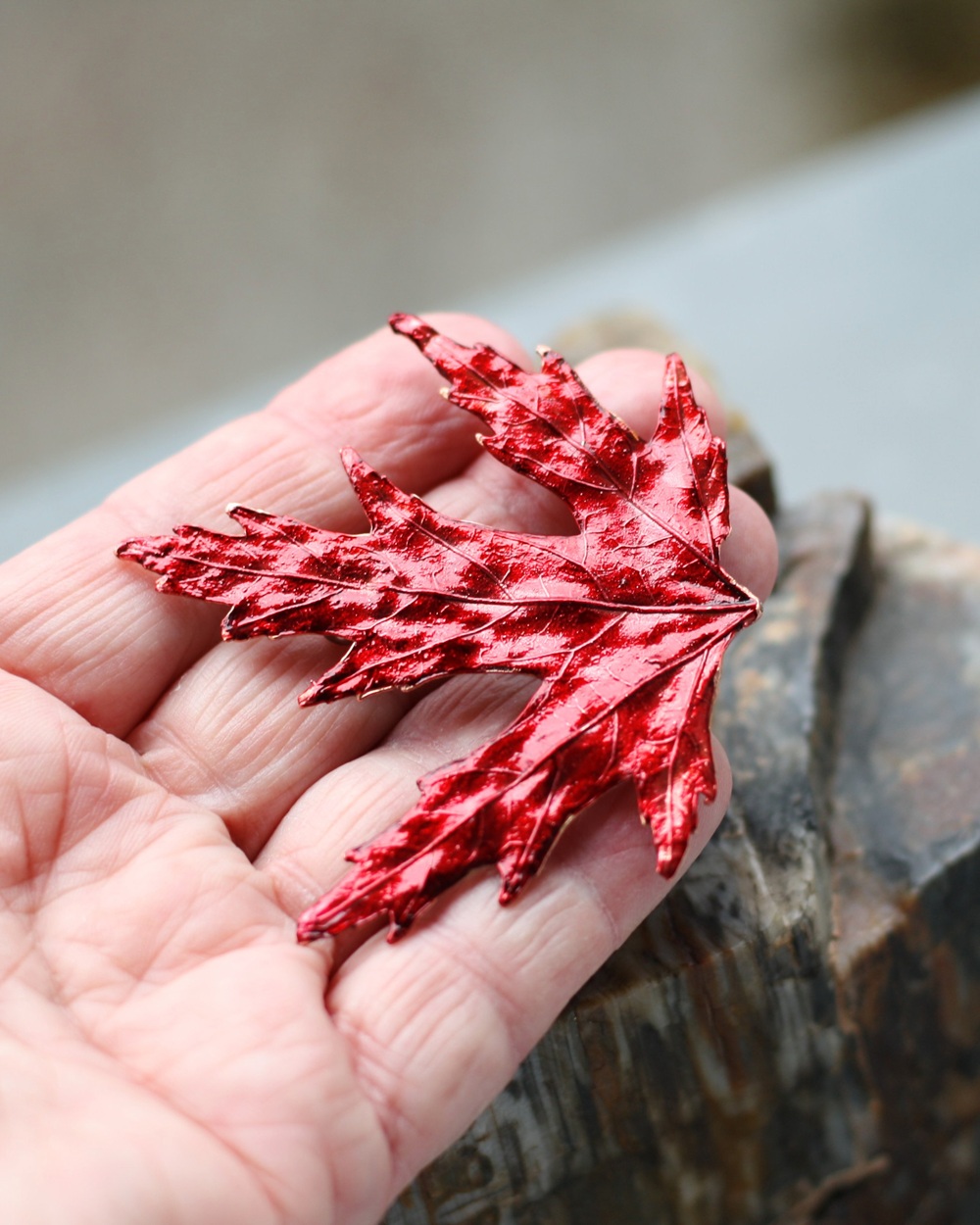 Brož z mědí pokoveného opravdového listu javoru technikou galvanoplastiky.
