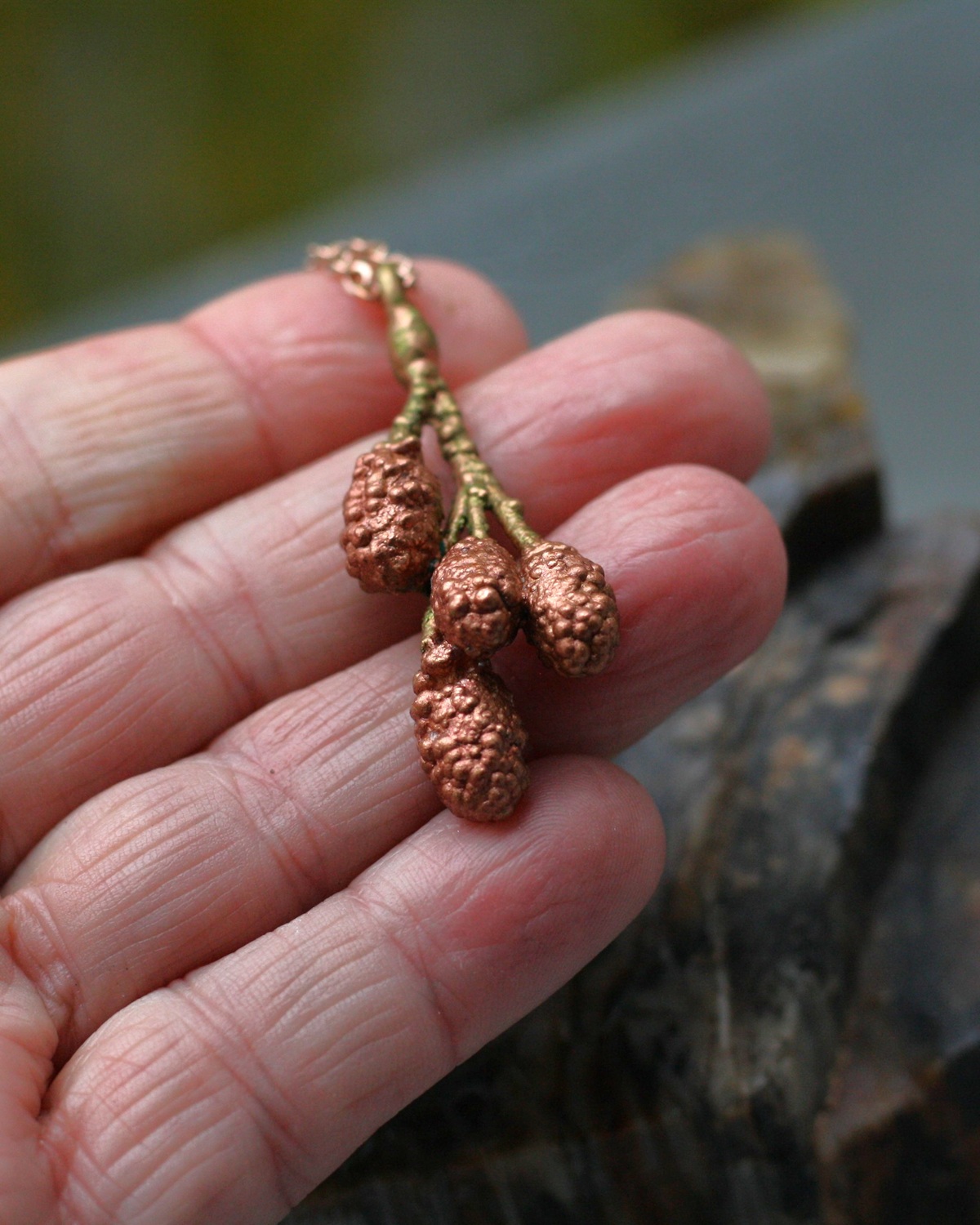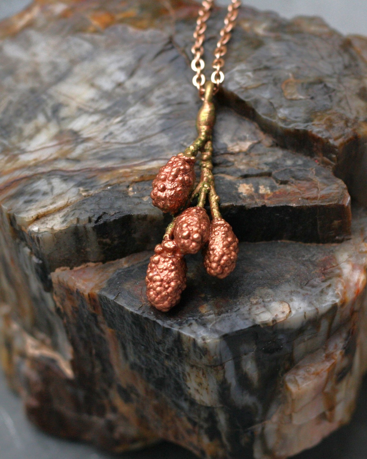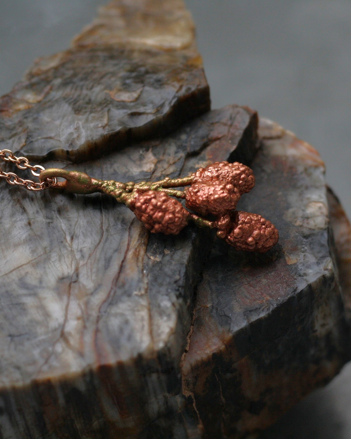 Šperk vznikl v mé dílně složitým a časově náročným procesem galvanickým pokovením ryzí mědí. Měď je pevná, přesně kopíruje povrch přírodniny, včetně prasklinek a různých nerovností.