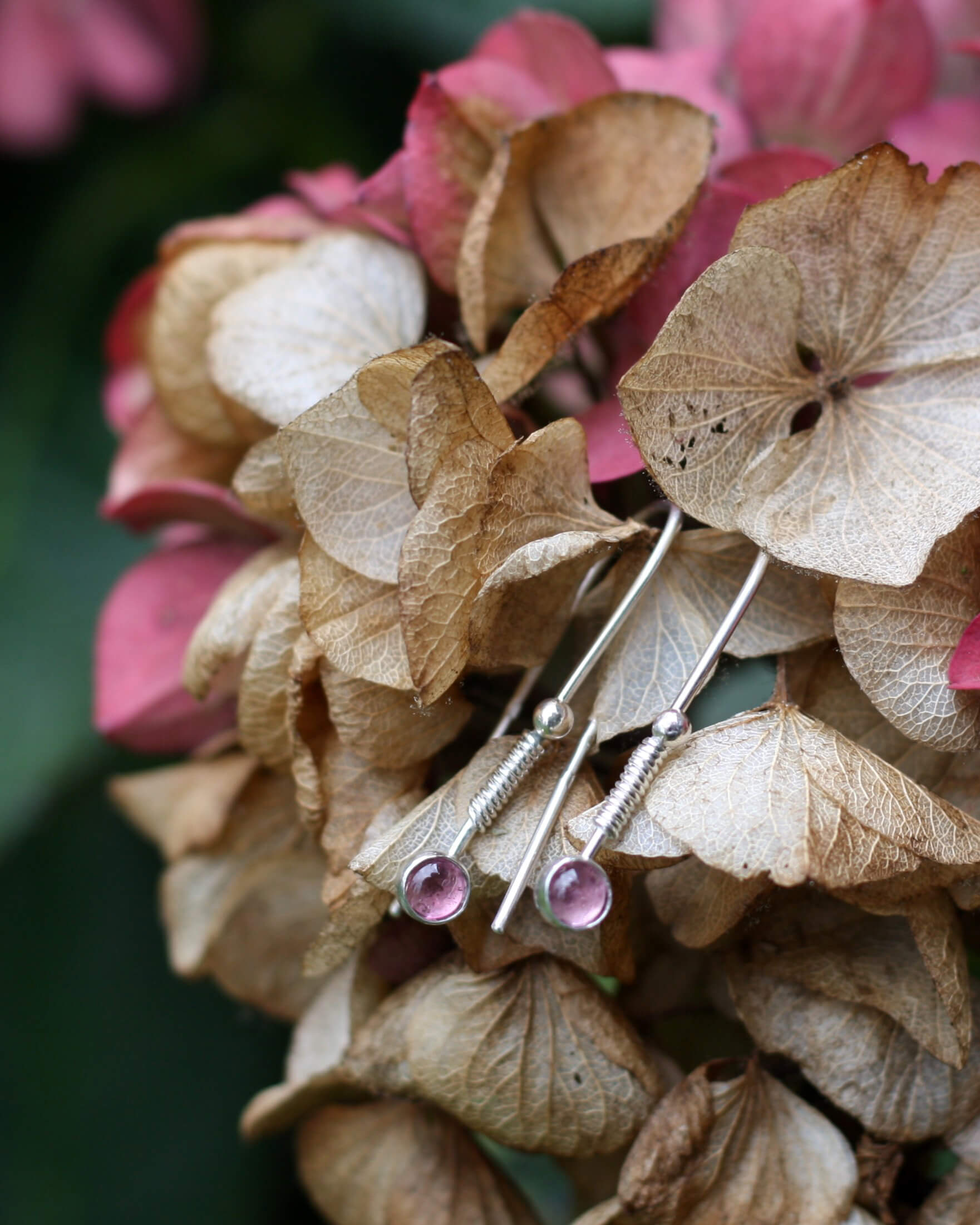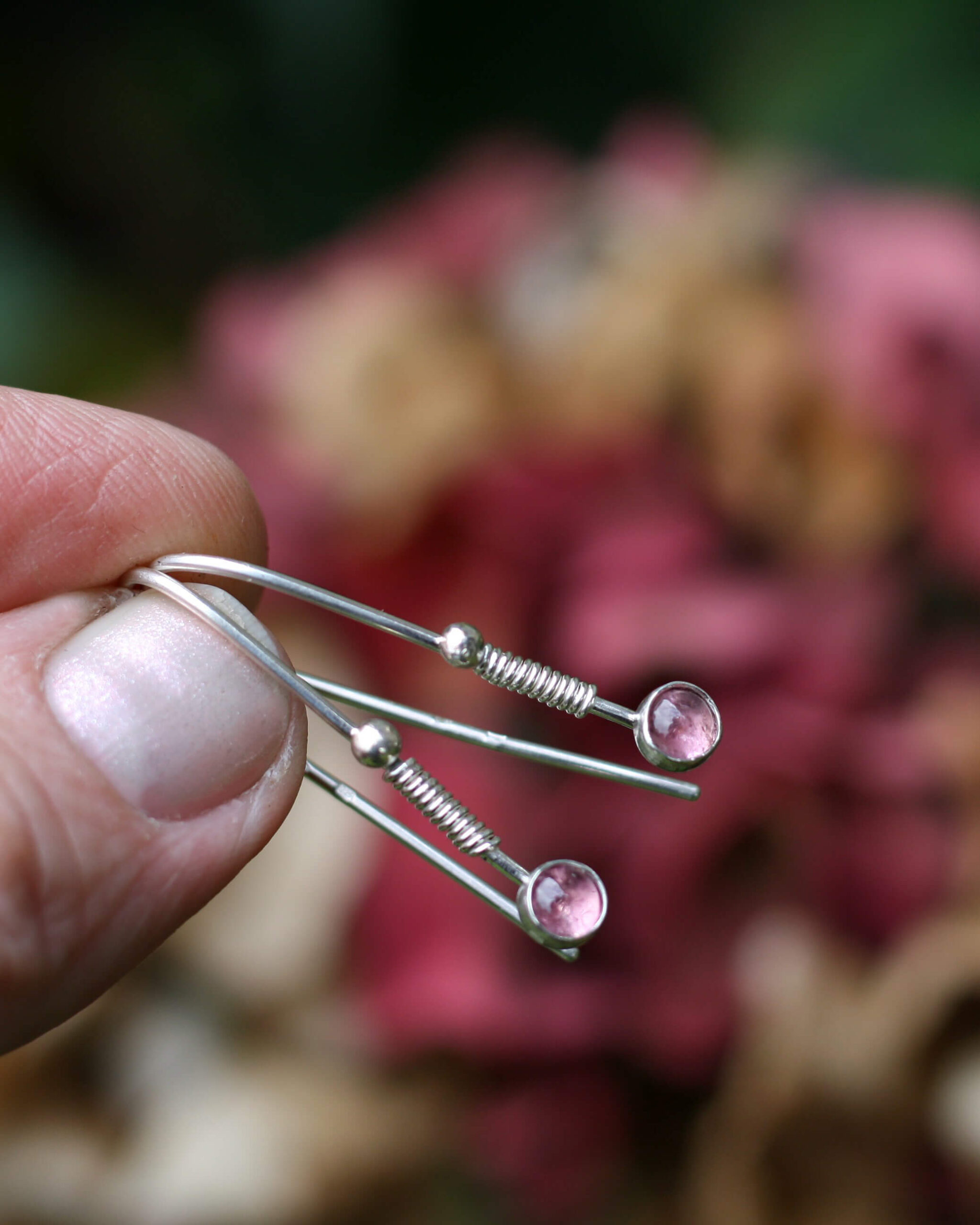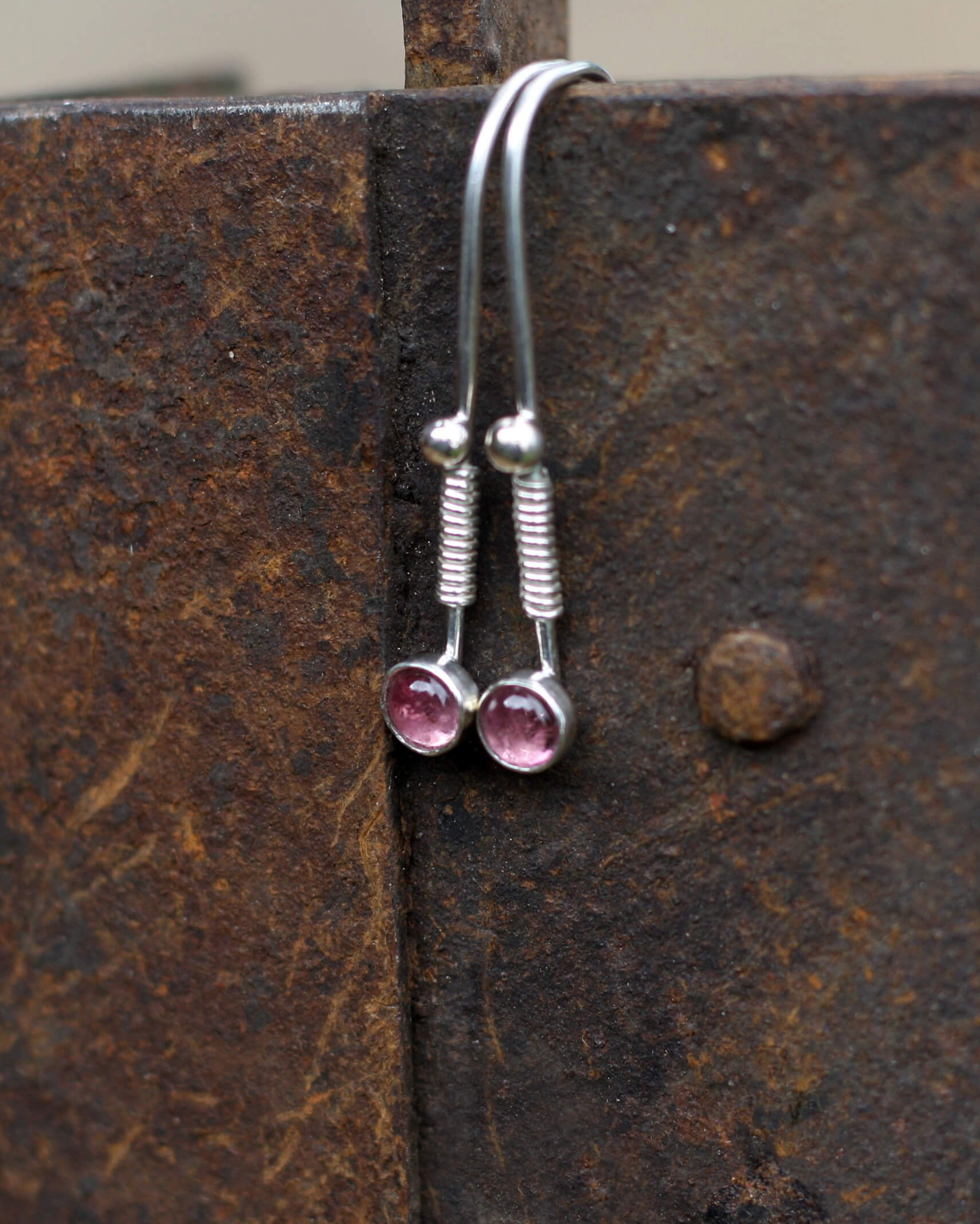 Jemné, ručně vyráběné, drobné stříbrné Ag 925/1000 visací náušnice s leštěným turmalínem rubelitem.