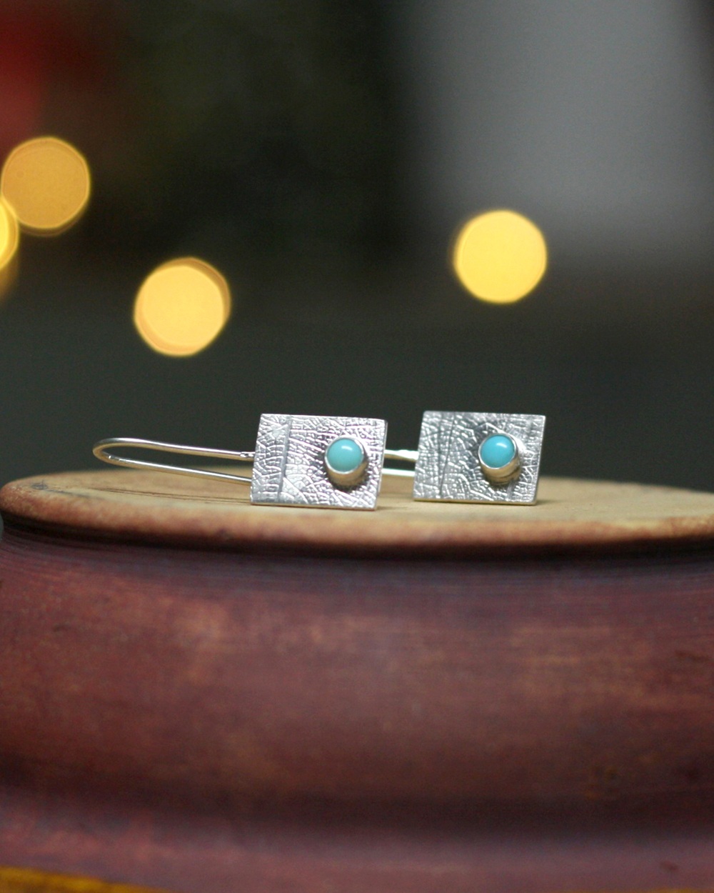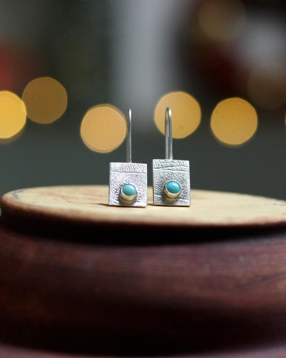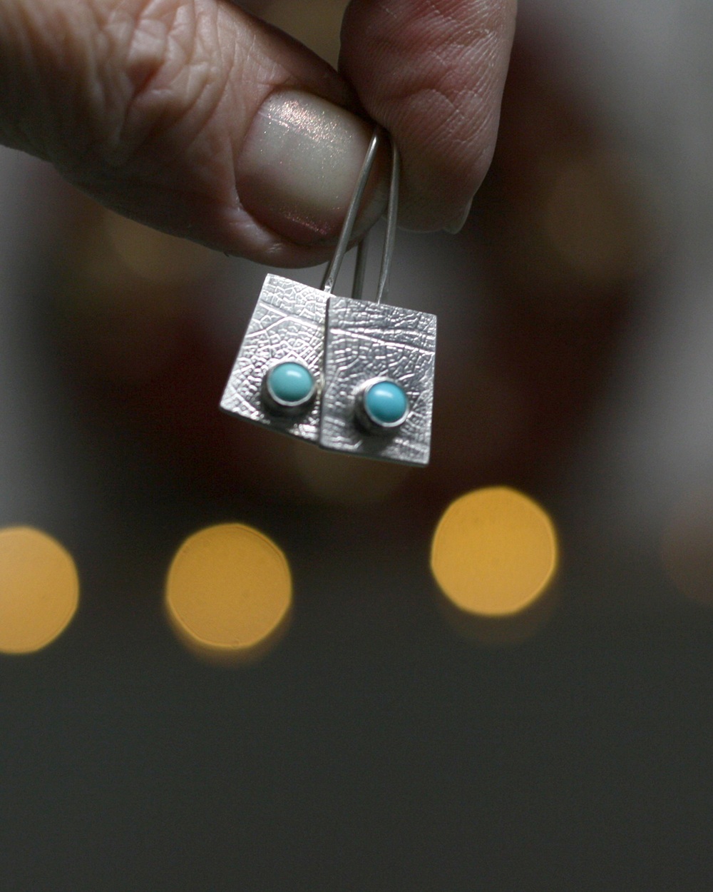 Ručně vyráběné stříbrné Ag 925/1000 visací, delší náušnice s tyrkysem a otiskem listu.